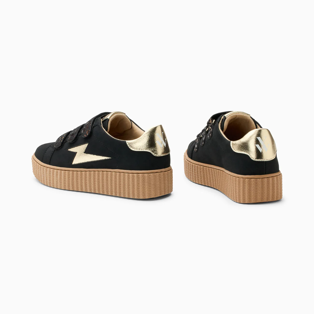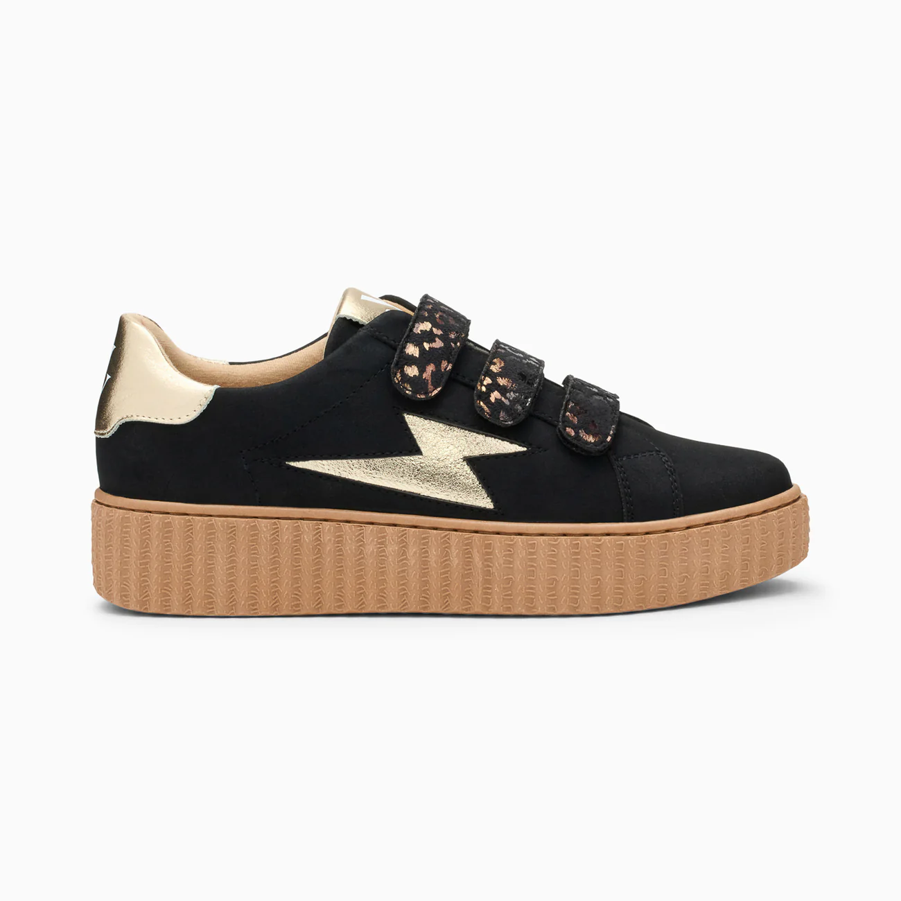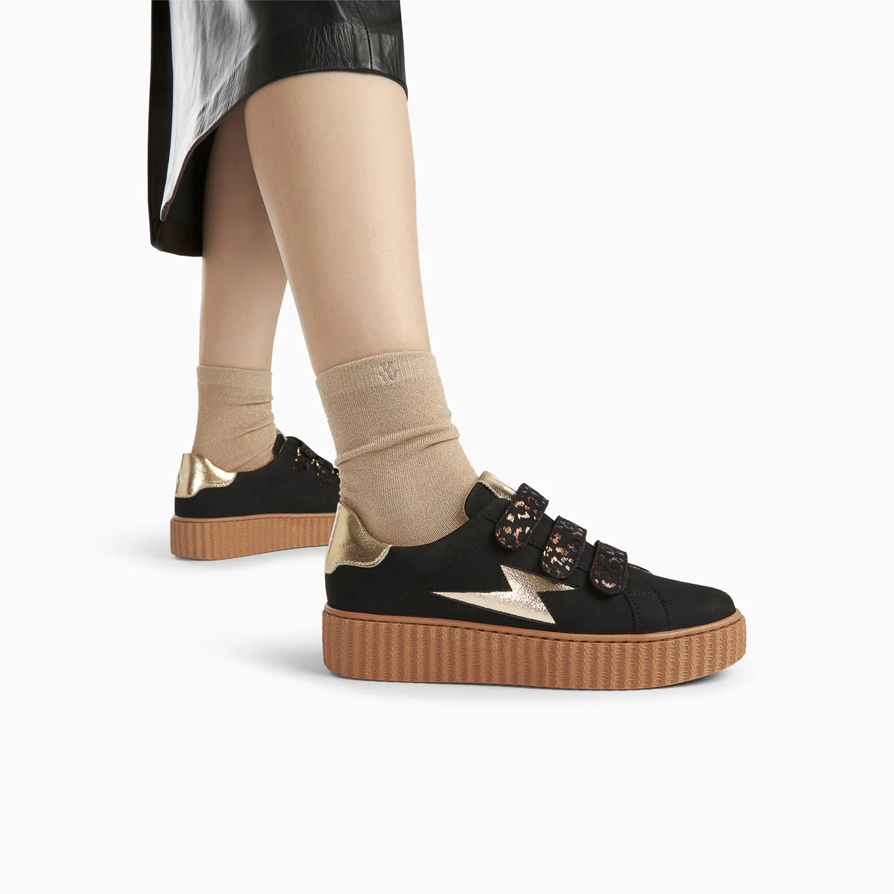 REF : BK2714NR – Baskets en suédine effet peau de pêche noire – Découpe en forme d’éclair et patch arrière en similicuir texturé or – Fermeture à scratchs en suédine noire imprimé léopard bronze métallisé – Bout rond – Semelle creepers camel Hauteur du talon : 4 cm Hauteur de la plateforme : 3 cm Hauteur de la tige : 6 cm Ce modèle taille normalement, prenez votre pointure habituelle. Pour les demi-pointures, préférez la taille du dessus.