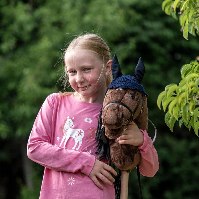 Pour habiller la jolie tête de cheval Hobby Horsing, quoi de mieux que le bonnet anti-mouches pour faire plus réaliste.