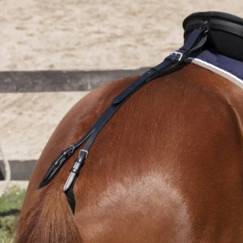 Si votre selle ou bardette n’est pas munie d’un anneau d’attache au niveau du troussequin, vous pouvez acheter une attache de croupière qui se glisse entre les coussins à l’arrière de la selle.