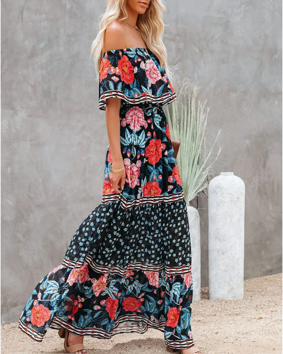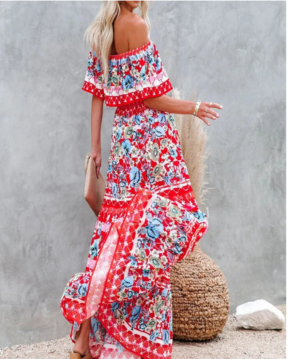 Cette Robe Longue Bohème Fleurie incarne parfaitement l’esprit bohémien grâce à ses motifs floraux éclatants. Son Col Bateau ajoute une touche de sensualité en dévoilant les épaules, et sa longue jupe colorée se termine élégamment au niveau des pieds.