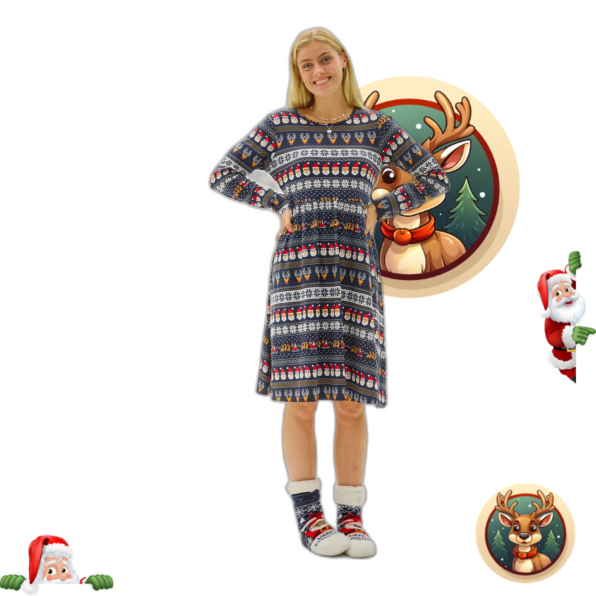 Entrez dans l’esprit festif avec notre charmante robe de Noël qui capture l’essence même des fêtes avec ses motifs enchanteurs : des flocons scintillants, bonnets du Père Noël, rennes joyeux et autres décors festifs.