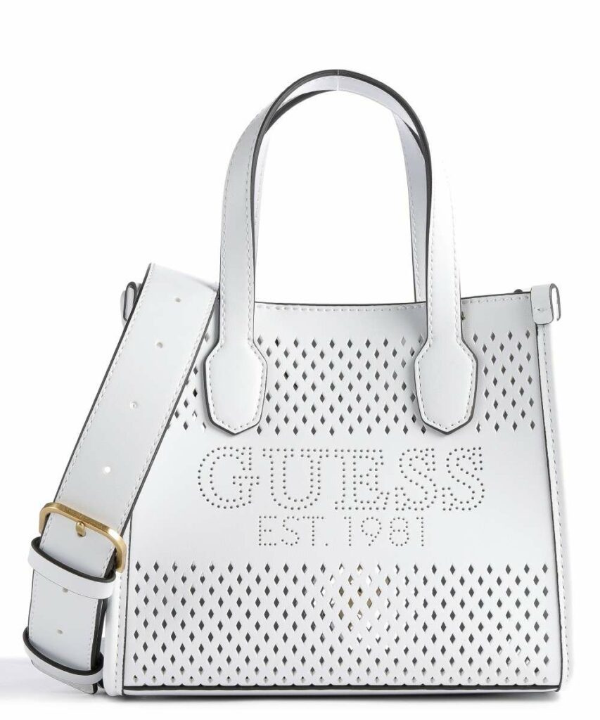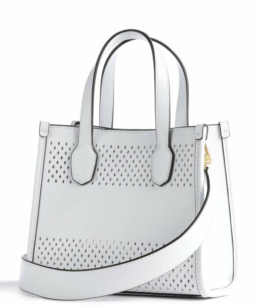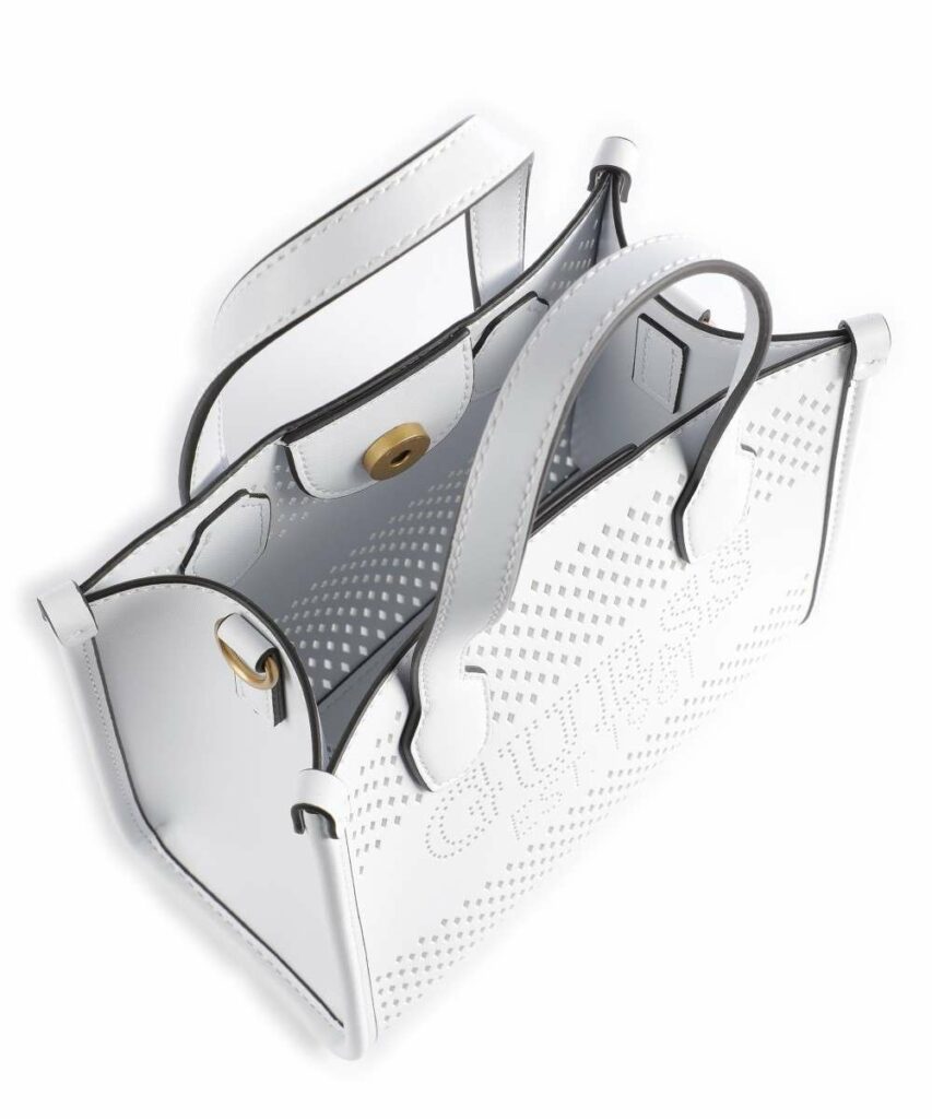 Code# HWWH8769760 Extérieur en matière ajourée. Fermeture à glissière. Pièces métalliques dorées. COMPOSITION TISSU PRINCIPAL : 100% polyuréthane. Dimensions 20 x 17 x 10 cm. Deux anses longueur env. 35 cm. Bandoulière, longueur env. 110/130 cm. Pochette intérieure avec glissière et bandoulière. Lettrage logo frontal.