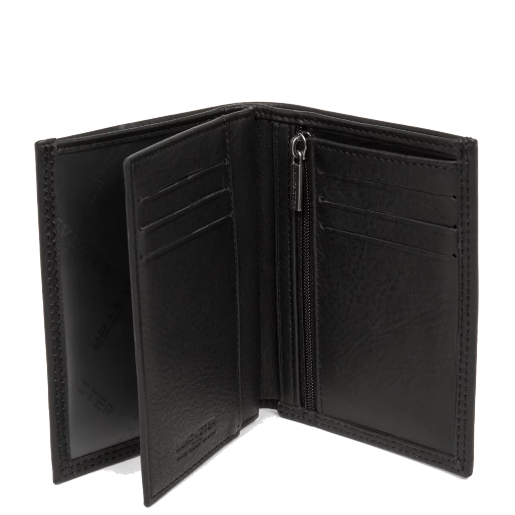 Porte-monnaie, porte billets, emplacement carte d’identité, emplacement permis de conduire, 8 emplacements carte. Taille : 9.5×12.0×2.0 cm Fermeture Pliée Matière Cuir de vachette pleine fleur Doublure Textile