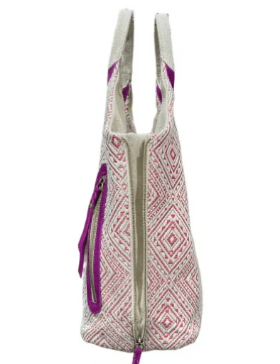 Cabas motif ethnique by Mila Louise pour Femme. – Porté épaule – Poche zippée – Poches plaquées – Fermeture zippée – Bouton aimanté – Zip sur les côtés – Finitions en cuir – Aspect tressé – Motif ethnique – Flèche : 25 cm – Dimensions : L45x H40 cm Composition 100% Textile ; Doublure : 100% Polyester