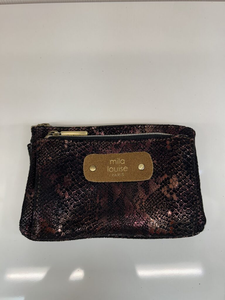 – Pochette/Porte monnaie Mila Louise tissu texturé brillant – Poche avant zippée – Fermeture principale à glissière – 2 compartiments intérieurs séparés par une ouverture Dimensions H 12 x L 17 x P 2 cm