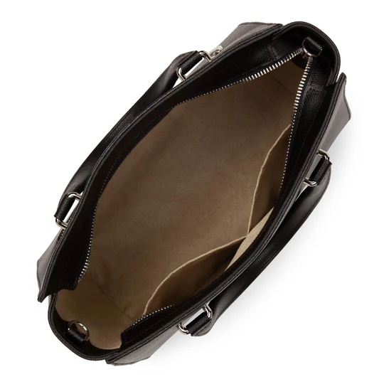 Ce sac à main est confectionné de refente de cuir de vachette grainé. Il comporte une grande poche principale et une poche extérieure zippée. Il se porte à la main, croisé ou à l’épaule. Taille 29 x 21 x 13 cm