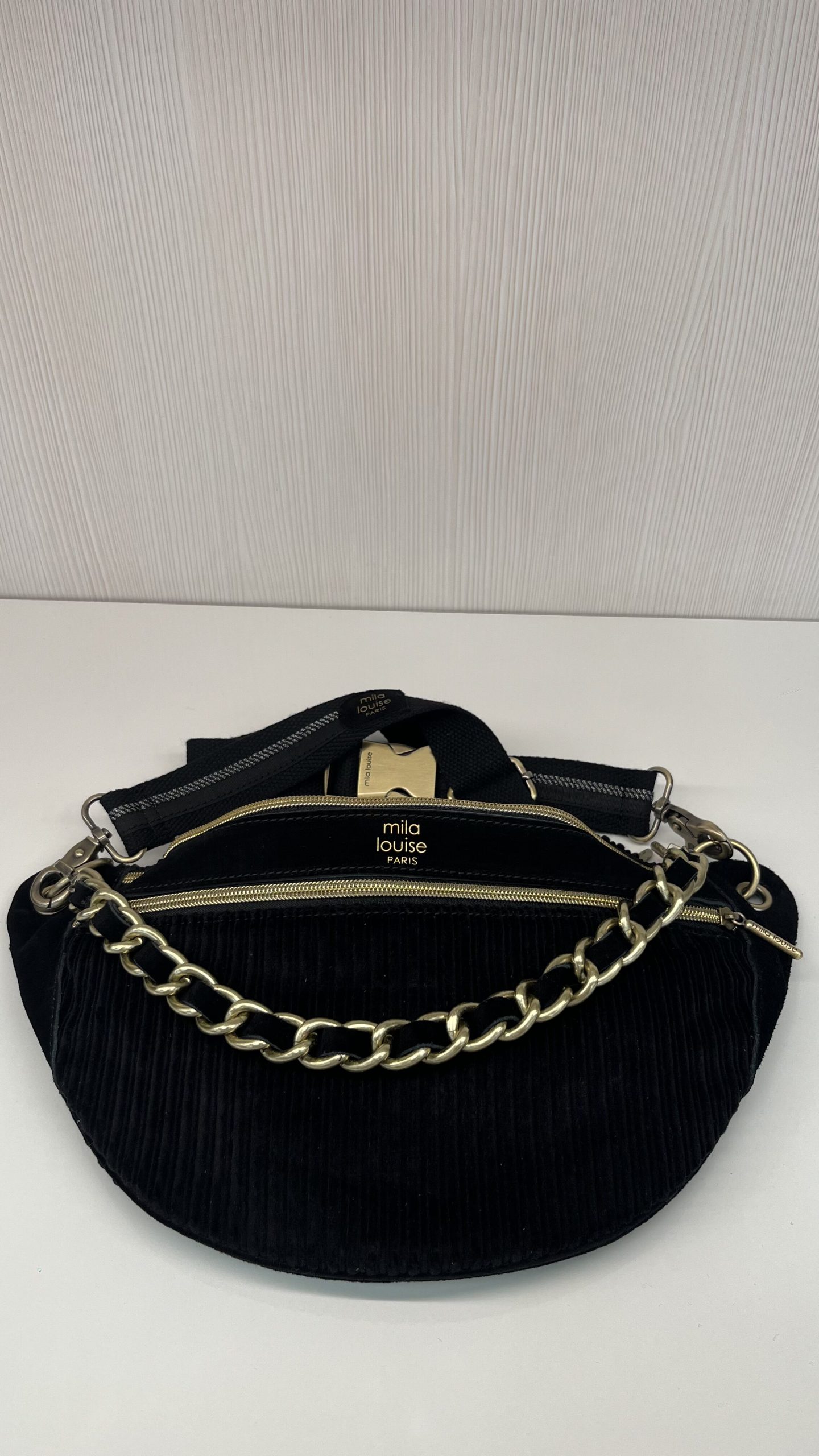 Sac banane en velours côtelé Sangle réglable et amovible Chaîne amovible Extérieur : 3 poches zipées Dimensions : h : 17,5 cm x l : 33,5 cm x p : 9 cm Composition : 100% polyester