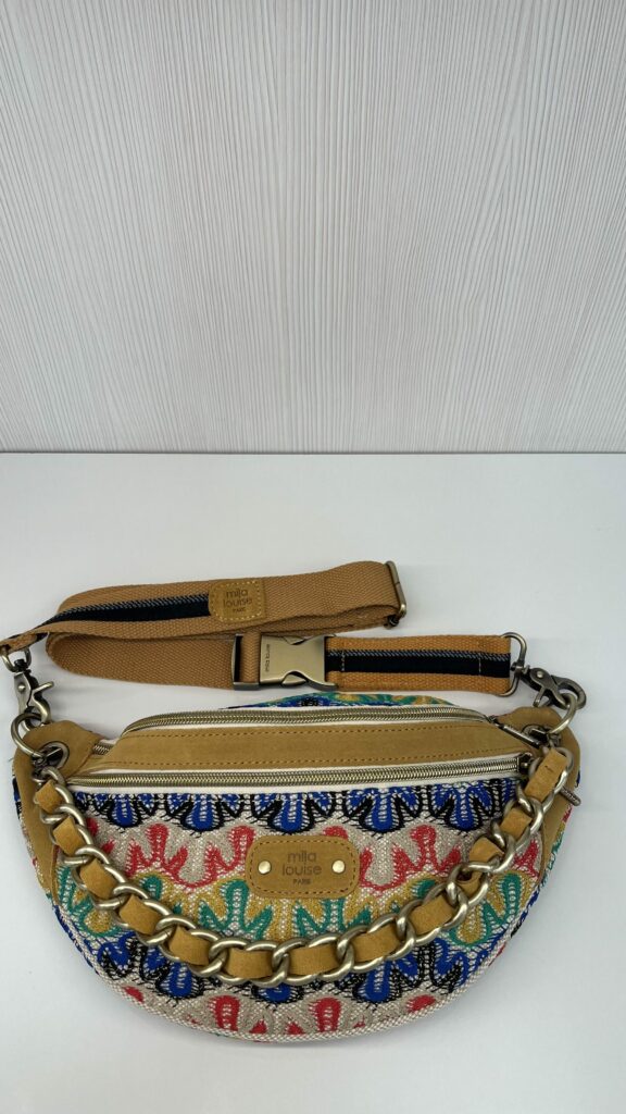 – Sac banane Mila Louise en croûte de cuir de vachette/denim – Sangle porté taille – Chaînette décorative – Poche avant et arrière à glissière – Fermeture zippée – Doublure fantaisie – Housse de rangementDimensions H 17 x L 29 x P 7 cm