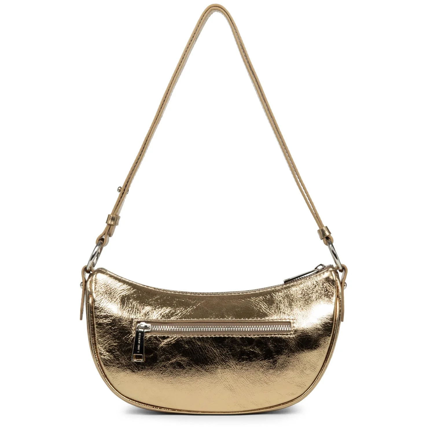 Ce sac demi lune est confectionné de cuir de vachette finition métallisée. Il comporte une grande poche principale. Il se porte à l’épaule ou croisé. Taille 23.0×13.0×6.0 cm Fermeture Zippée Matière Cuir de vachette finition métallisée Doublure Textile Finition Métal argenté brillant Type de portée Porté travers, porté épaule Bandoulière Réglable REF : 480-042-OR