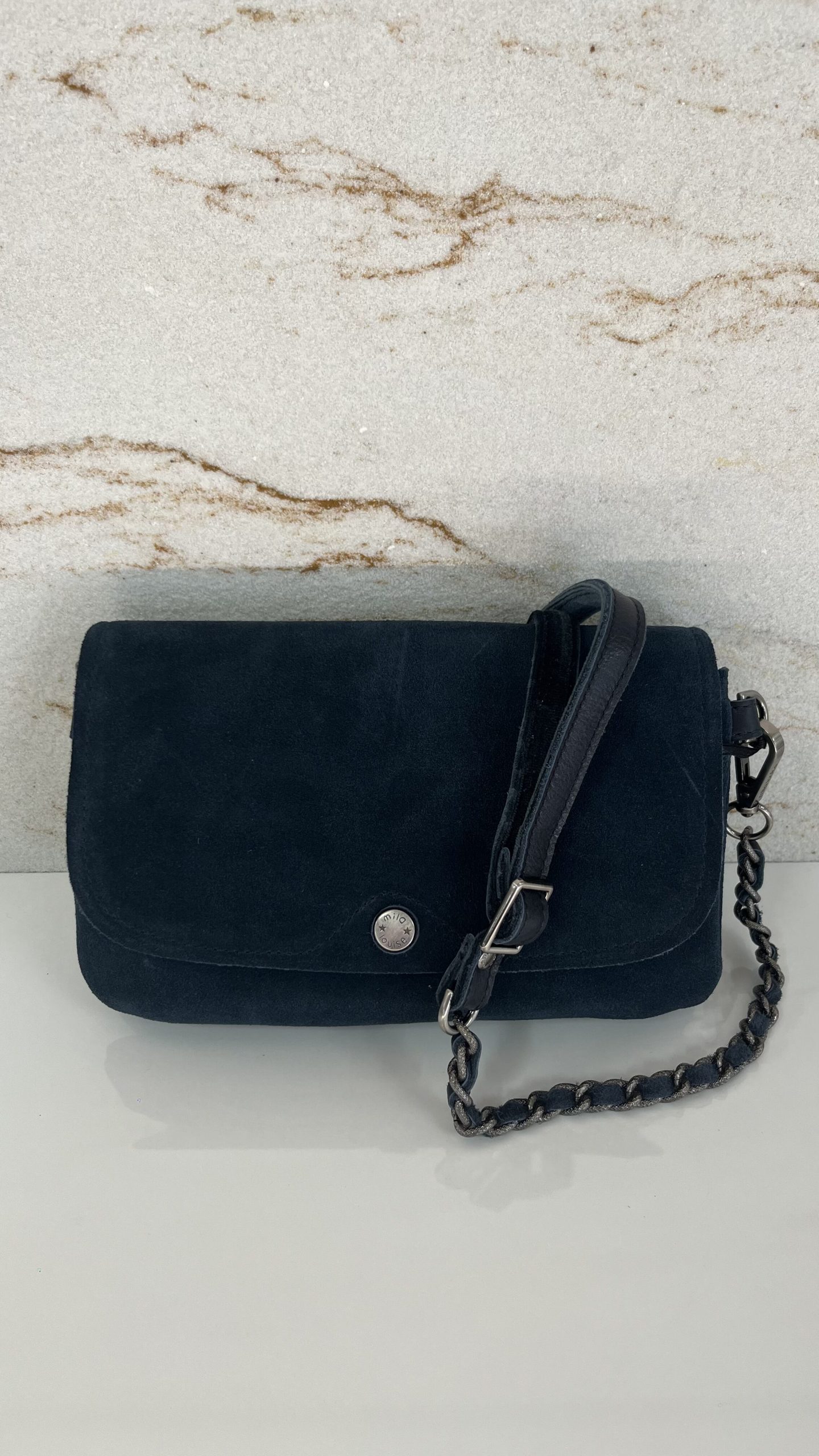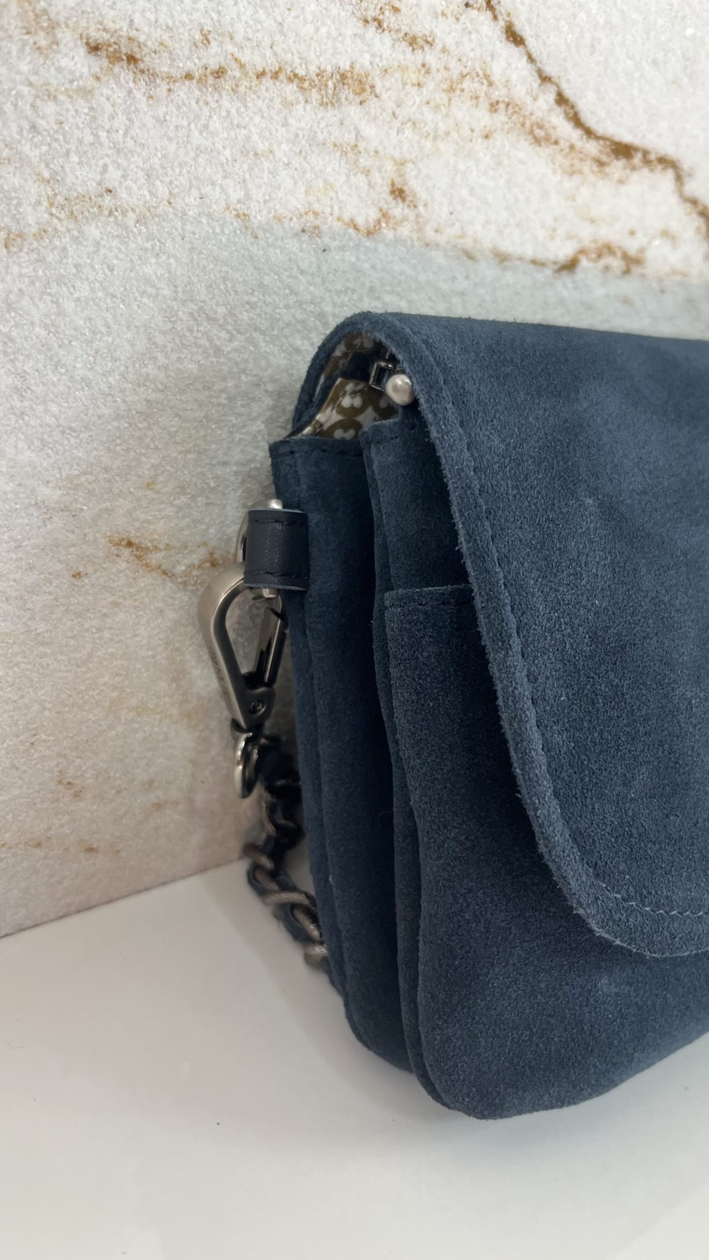 Sac pochette à rabat en croute de cuir, conçu pour être porté à l’épaule grâce à une anse ajustable. La pochette se ferme à l’aide d’une fermeture éclair. À l’intérieur, le sac est composé de 2 compartiments, ainsi qu’une partie dédiée au rangement des cartes. Dimensions : 21 x 14 x 4 cm Poids : 300 g