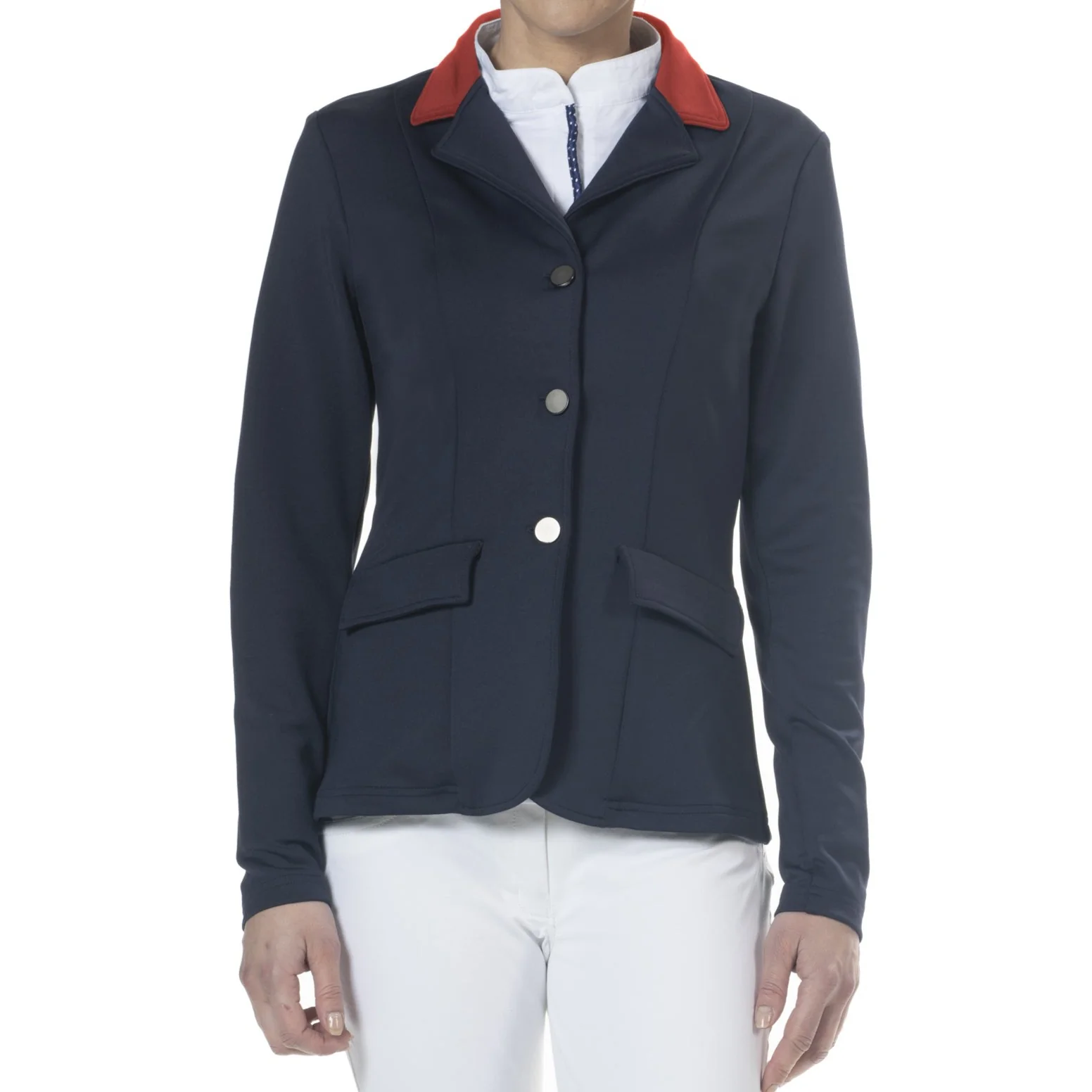 La veste de concours taillée pour vos graines de cavalières de 6 à 16 ans. Col rouge contrasté sur veste marine. Matière élastiquée respirante et agréable à porter. Deux poches latérales avec rabat. Lavable en machine jusqu’à 40°C. Composition: 90% polyester, 10% élasthanne Coloris: marine Tailles: 6A, 8A, 10A, 12A, 14A, 16A
